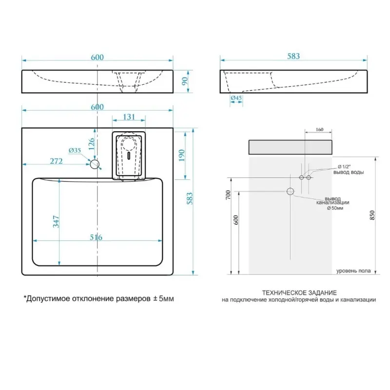 | Отверстия под смеситель | На 1 отверстие |